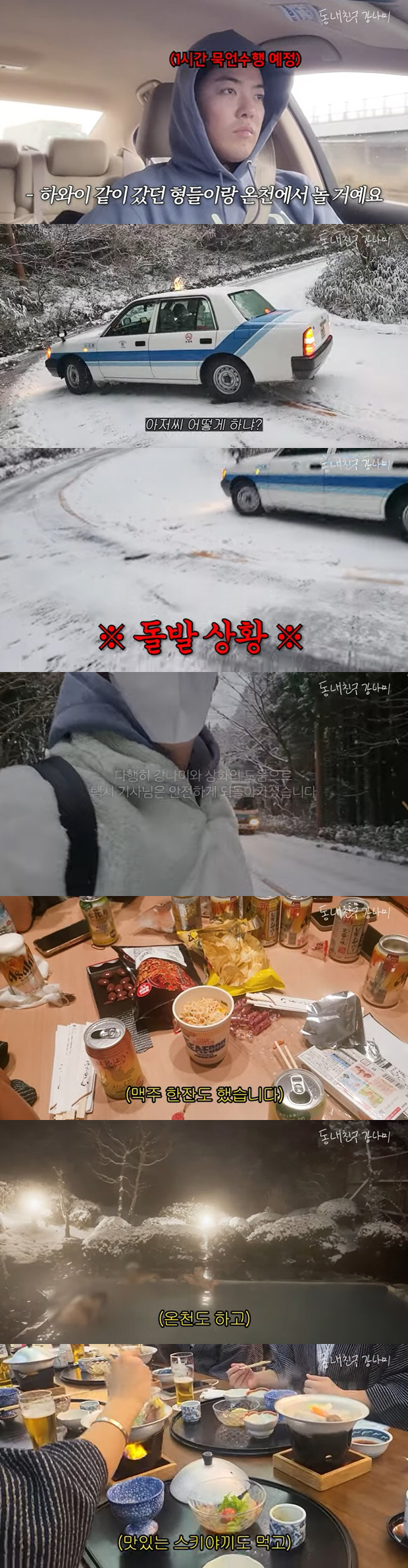 그런데 직접 운전해서 여행지로 이동하던 두 사람은 폭설로 인해 택시로 갈아탔다. 강남은 "여름 타이어여서 차가 미끄러지기 시작했다. 40분 걸려서 산을 다시 내려가서 역에 가서 주차하고 택시를 타고 여행지로 다시 가고 있다"라고 상황을 설명했다.