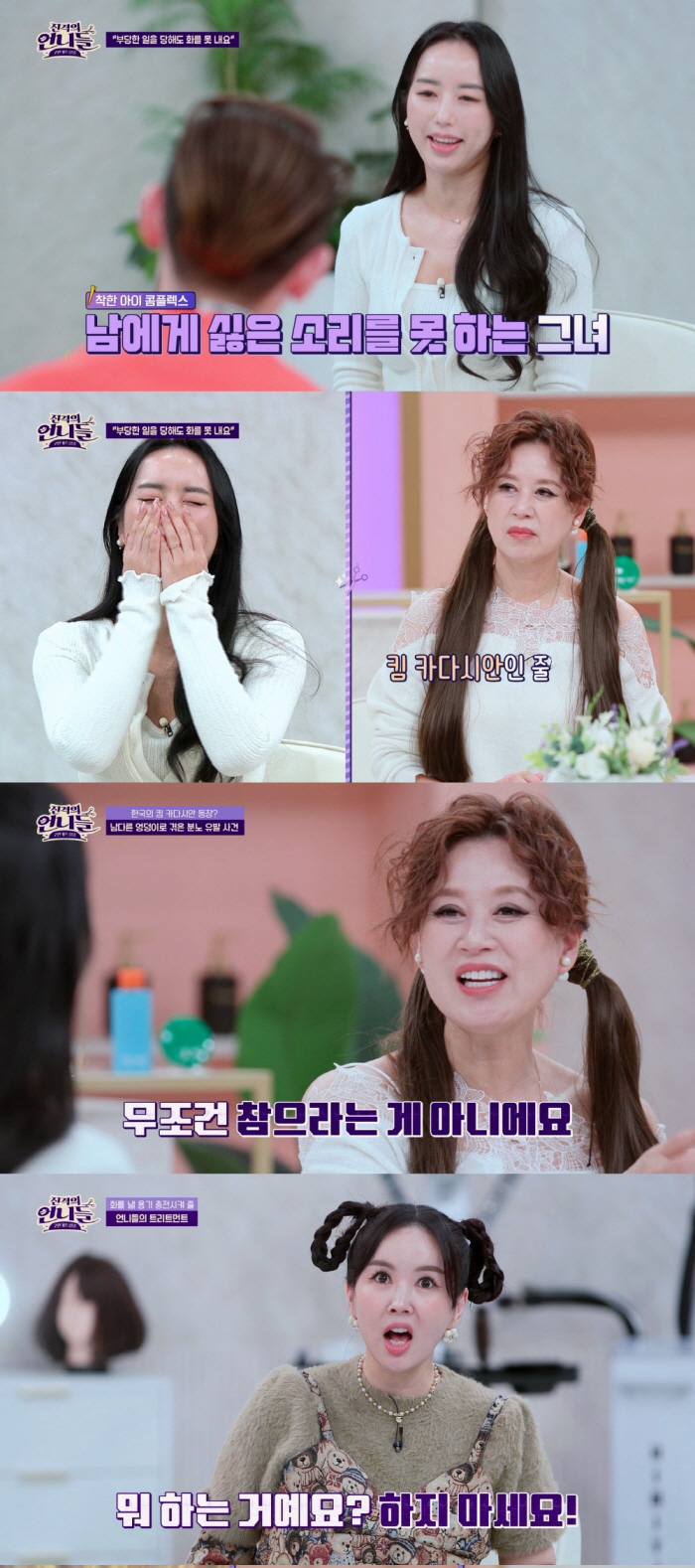 [스포츠조선 고재완 기자] 채널S '진격의 언니들-고민커트살롱'에서 "착한아이 콤플렉스 때문에 부당한 일을 당해도 화를 못 내겠다"는 고민을 가진 사연자가 등장했다.
