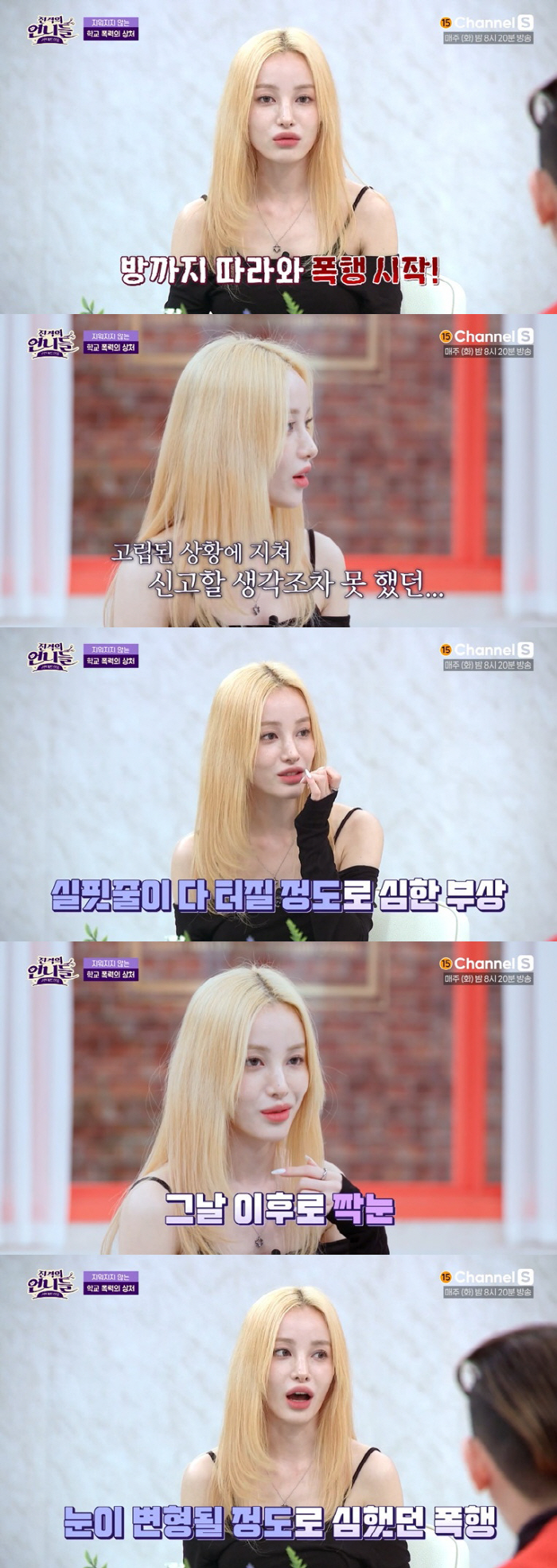 유깻잎은 "눈을 주먹으로 맞은 적이 있는데 그때 핏줄이 터져서 새빨개지고 멍이 들었다. 너무 티가 나니까 신고할까 봐 집을 안 보내줬다. 부기가 빠지면서 짝눈이 됐다"고 후유증을 고백했다.