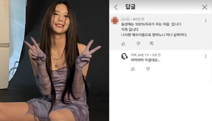 8일 지애는 자신의 계정에 한 네티즌이 "동성애는 100% 마귀가 주는 마음 입니다. 지옥 갑니다. 나사렛 예수 이름으로 명하노니 떠나 갈찌어다"라는 댓글을 남겼다.