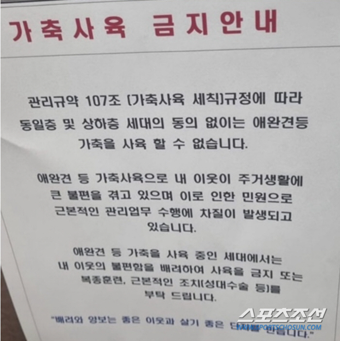 공지문은 "아파트 관리규약에 따라 '동일층 및 상하층 세대의 동의 없이는 애완견 등 가축을 사육할 수 없다'"며 "애완견 등 가축을 사육 중인 세대에서는 내 이웃의 불편함을 배려해 사육을 금지 또는 복종 훈련, 근본적인 조치(성대 수술 등)를 부탁드린다"고 언급했다.