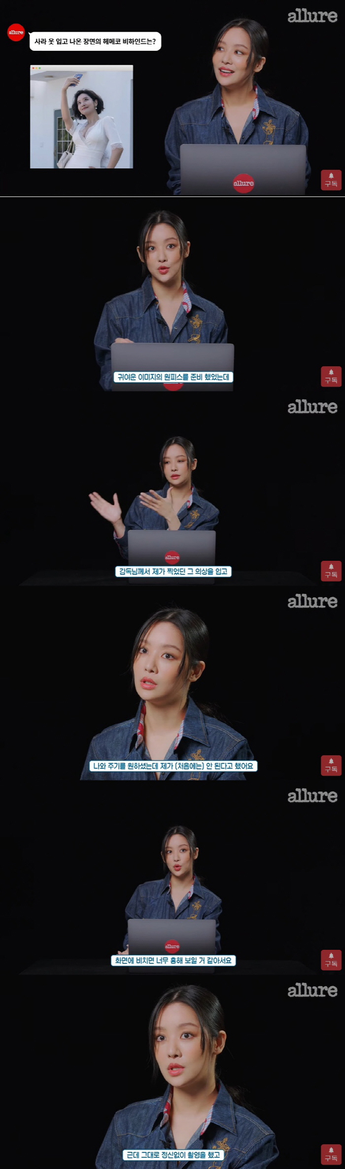 차주영의 파격 노출신에 과거 인터뷰 영상도 다시 재조명되고 있다. 차주영은 지난 1월 넷플릭스 '더 글로리' 파트1이 공개된 후 얼루어와의 인터뷰를 진행했다. 당시 차주영은 화제가 됐던 '흰 원피스' 장면의 비하인드도 언급했다. 차주영은 원래 그 의상을 입으려던 게 아니었다며 "저희가 스타일팀에서 준비한 의상이 있었다. 트위트 소재의 조금 더 기장이 짧고 (몸에) 덜 달라붙는 귀여운 이미지의 원피스를 준비했다"며 "그런데 감독님께서 제가 찍었던 그 의상을 입고 나와 주기를 원하셨는데 제가 안 된다고 했다. 화면에 비치면 너무 흉해 보일 거 같아서. 근데 그대로 정신 없이 촬영을 했고 그게 이렇게 화제가 될 지 몰랐다"고 밝혔다.