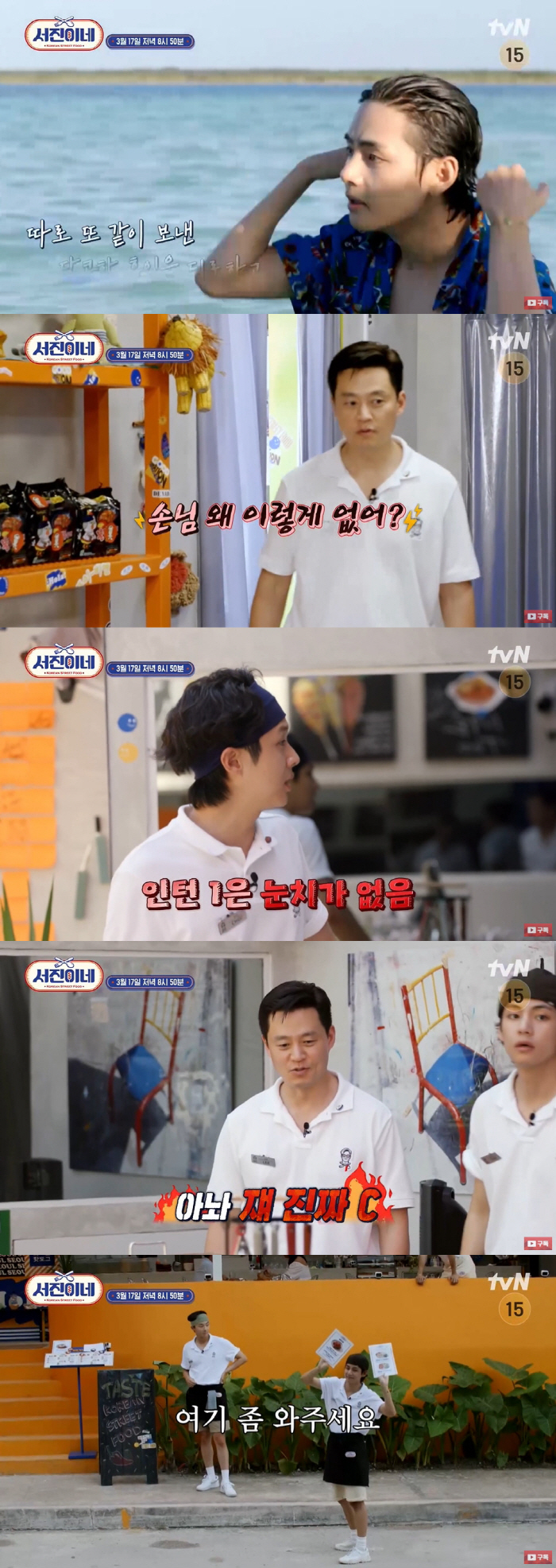 달콤한 휴일이 끝나고 다시 출근에 나선 직원들. 하루 쉬어 부쩍 예민해진 사장 이서진은 "손님 왜 이렇게 없냐"면서 초조, 불안, 분노 3단계로 웃음을 안겼다. 그때 최우식은 "일찍 퇴근 할까요?"라고 말해 이서진을 버럭 하게 만들었다. 그때 박서준과 뷔는 손님을 모으기 위해 가게 앞에서 춤을 추는 등 필살기를 발휘, 이에 '서진이네'는 위기를 극복할 수 있을 지 궁금증을 자아냈다.