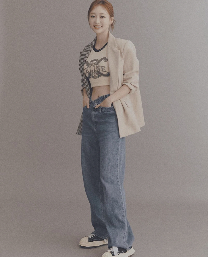 공개된 사진에는 독특한 스타일의 재킷과 크롭 티셔츠, 와이드 데님 팬츠를 매치한 박지영이 환하게 웃으며 카메라를 응시하고 있다.