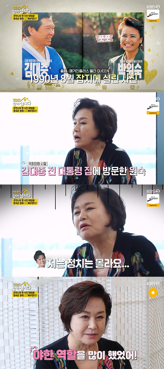 그는 "'한 지붕 세 가족'에서 '순돌이 엄마' 역할을 할 때 서민 정책 이미지와 부합이 되서 김대중 전 대통령 집을 방문했다"면서 "방문 후에 입당 하라고 하더라"고 입당 권유를 받았다고. 하지만 박원숙은 "저는 정치는 몰라요"라고 했다고 덧붙였다.