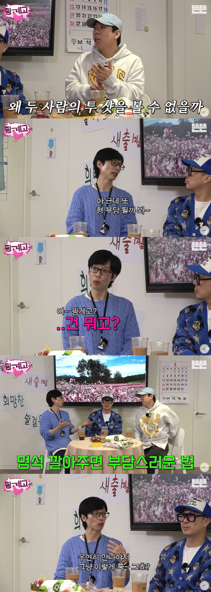 유재석의 강호동 언급에 양세찬과 하하는 "두 분이서 같이 하는 걸 보고 싶다", "근데 안 되는 이유는 뭐냐. 방송을 뭐 크게는 아니어도 투샷이 안 되는 이유가 뭐냐. 전국민이 원하고 궁금했는데. '핑계고'에도 한 번 나올 수 있지 않냐"고 강호동과 유재석이 방송에서 만나지 않는 이유를 궁금해했다.