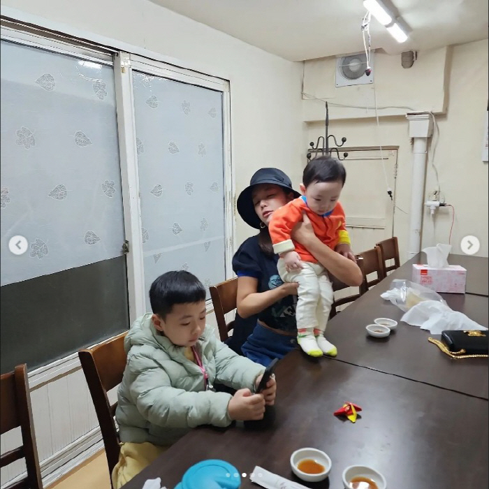 공개된 사진 속에는 가족들과 함께 맛집을 찾은 황정음의 모습. 이때 황정음은 모자이크로 얼굴을 가려서 공개했던 두 아들의 모습을 공개했다.