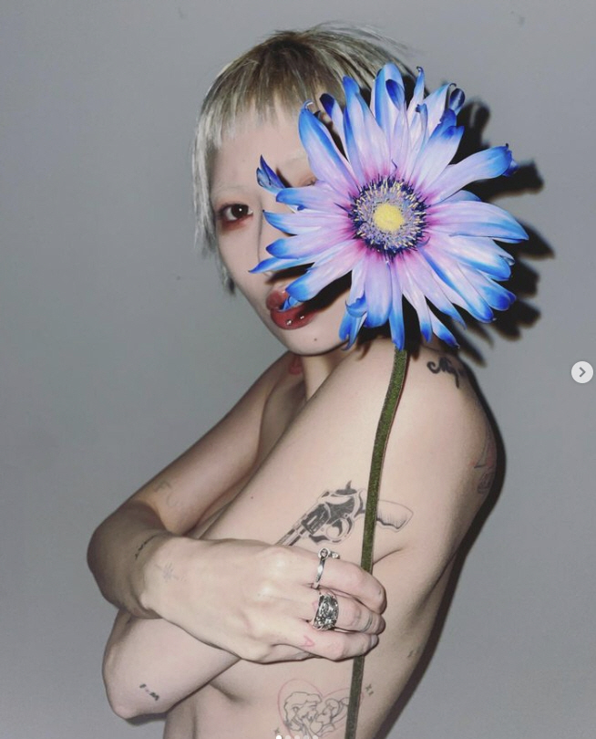 최근 금발 숏컷으로 팬들을 놀라게 했던 현아는 이번에는 상의 탈의에 대형 꽃을 들고 아찔한 포즈를 선사했다.
