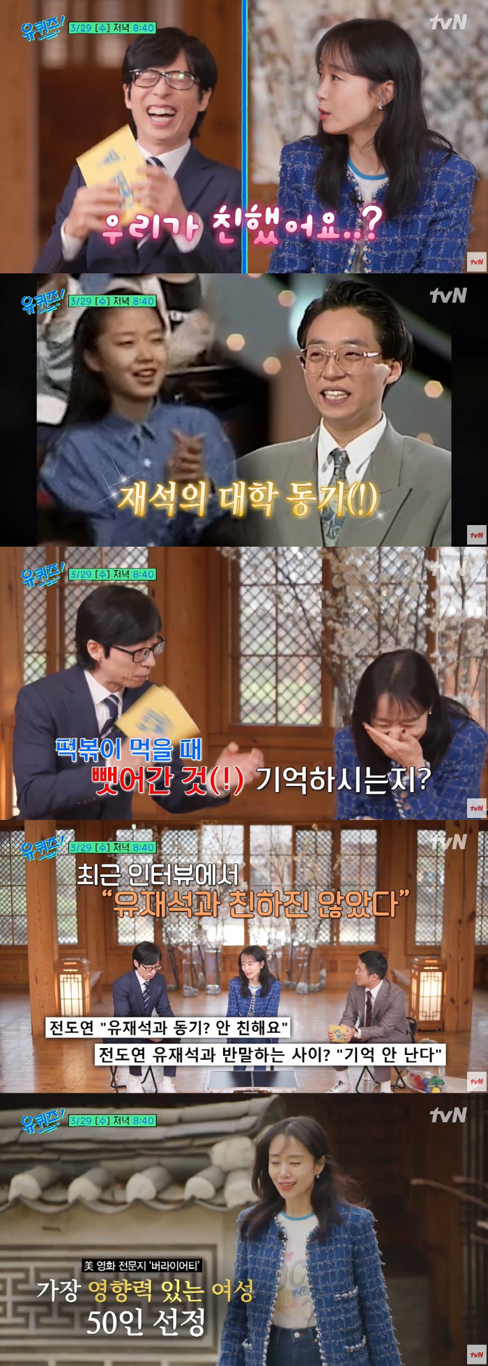 [스포츠조선닷컴 정안지 기자] 배우 전도연이 유재석과의 대학 시절을 떠올리며 "우리가 친했냐"고 말해 폭소를 안긴다.