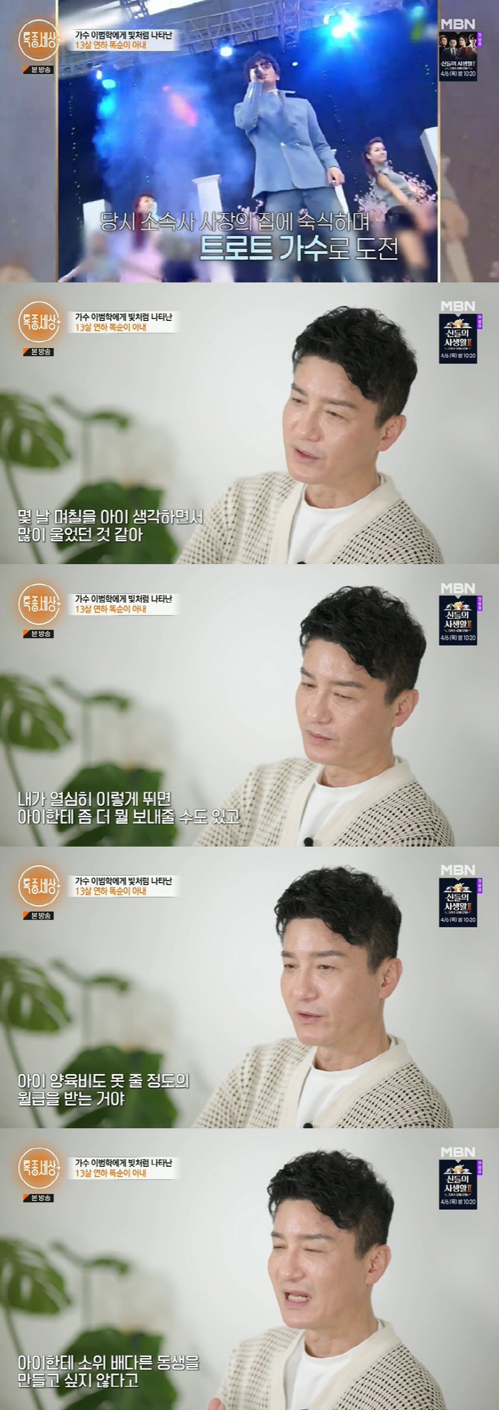 이혼 후 딸에게 죄책감이 컸던 이범학은 트로트 가수로 전향해 활동했다. 소속사 사장 집에서 숙식하며 지냈지만 큰 성과는 없었다. 이범학은 "몇 날 며칠을 아이 생각하면서 울었다. 아이가 보고 싶기도 하고 미안하기도 하고. 내가 열심히 이렇게 뛰면 아이한테 좀 더 뭘 보낼 수도 있고. 그렇게 생각했는데 점점 안 되는 느낌"이라며 "물방울 무늬 옷, 반짝이 옷 입으면서 다니는데 아이 양육비도 못 낼 정도의 월급을 받는 거다. 내가 또 바보 같은 짓을 했구나 싶었다"고 털어놨다.