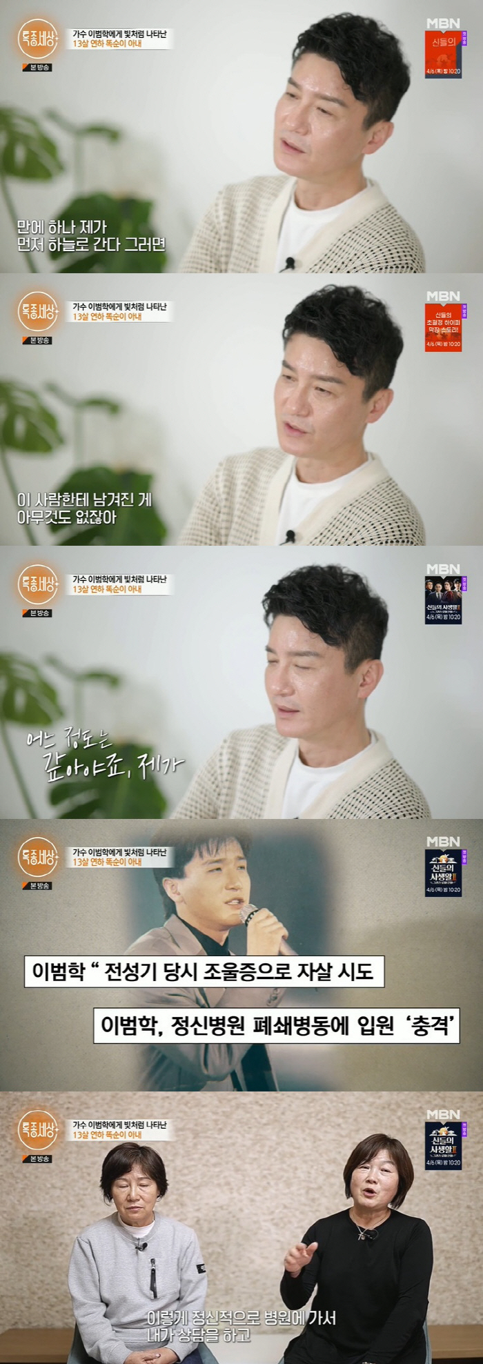 이범학의 조울증은 심각했다. 이범학은 정신병원 폐쇄병동에 입원, 극단적 시도까지 했다고. 이 모습을 바로 옆에서 지켜봐 온 누나들은 지금의 이범학이 그저 고마울 뿐이다. 이범학은 "5주 연속 트로피는 타지만 (이범학의) 마음은 그러지 않았다. 정신적으로 많이 힘들어했기 때문에 그걸 보는 저는 더 힘들다. 요새는 우울증이라는 게 많이 대중화되어 있는 상황이지 않냐. 그때는 그런 게 없었다"며 안타까워했다.