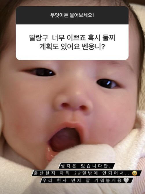 또 한 팬은 "딸 너무 예쁘죠. 혹시 둘째 계획도 있어요?"라고 물었고, 이에 벤은 "생각은 있습니다만, 출산한 지 아직 58일밖에 안되어서..우리 천사 먼저 잘 키워볼게요"라고 답했다.