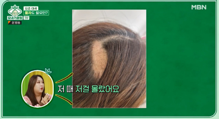풍자는 "2년 전쯤에 너무 사랑한 친구가 유명을 달리해서 그때 스트레스를 많이 받았다"며 "난 몰랐는데 뒤통수 정수리 쪽에 원형 탈모가 왔다"며 당시 사진을 공개했다. 풍자의 정수리는 심각한 원형 탈모로 인해 텅 비어있어 놀라움을 안겼다.
