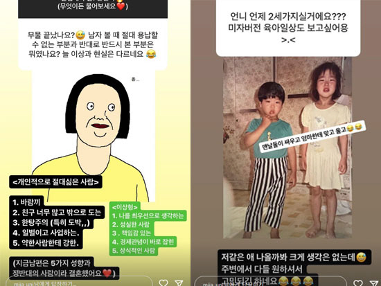 마지막으로 "언제 2세 가지실 거에요? 미자버전 육아일상도 보고 싶어요"라고 묻자, 미자는 "저 같은 애 나올까봐 크게 생각은 없는데, 주변에서 다들 원하셔서 고민되긴 하네요"라고 이야기했다.