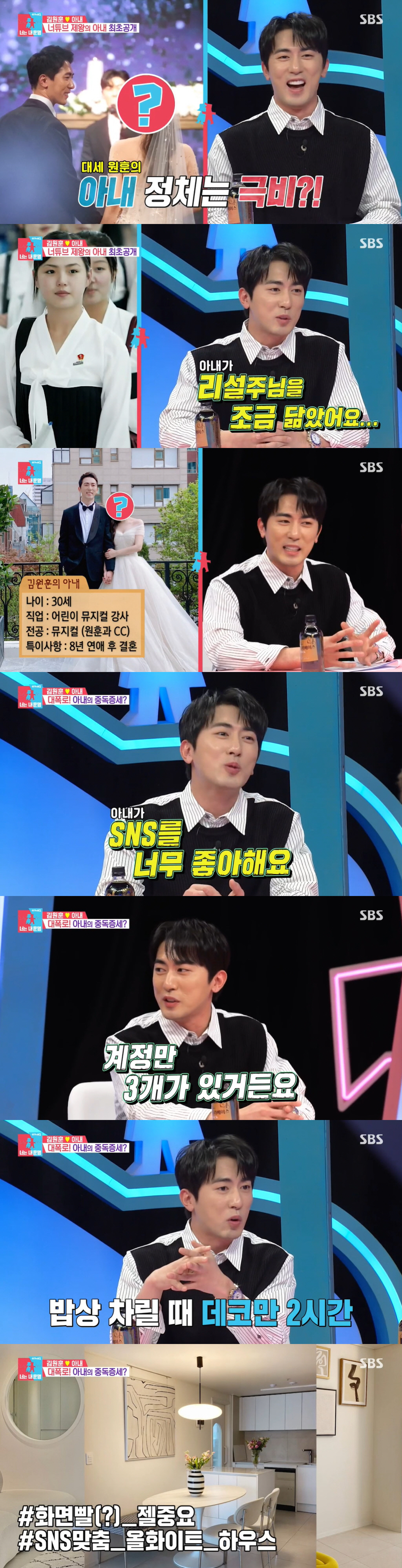 김원훈은 "아내가 SNS를 너무 좋아한다. 계정만 3개가 있다. 사진에 진심이다"라며 아내의 SNS 중독을 폭로했다. 그러면서 그는 "아침 밥상 차릴 때 데코만 2시간 걸린다. 신혼집도 올 화이트다. 집에서 빨간 음식은 절대 못 먹는다. 거의 파스타를 먹는다"고 해 웃음을 안겼다.