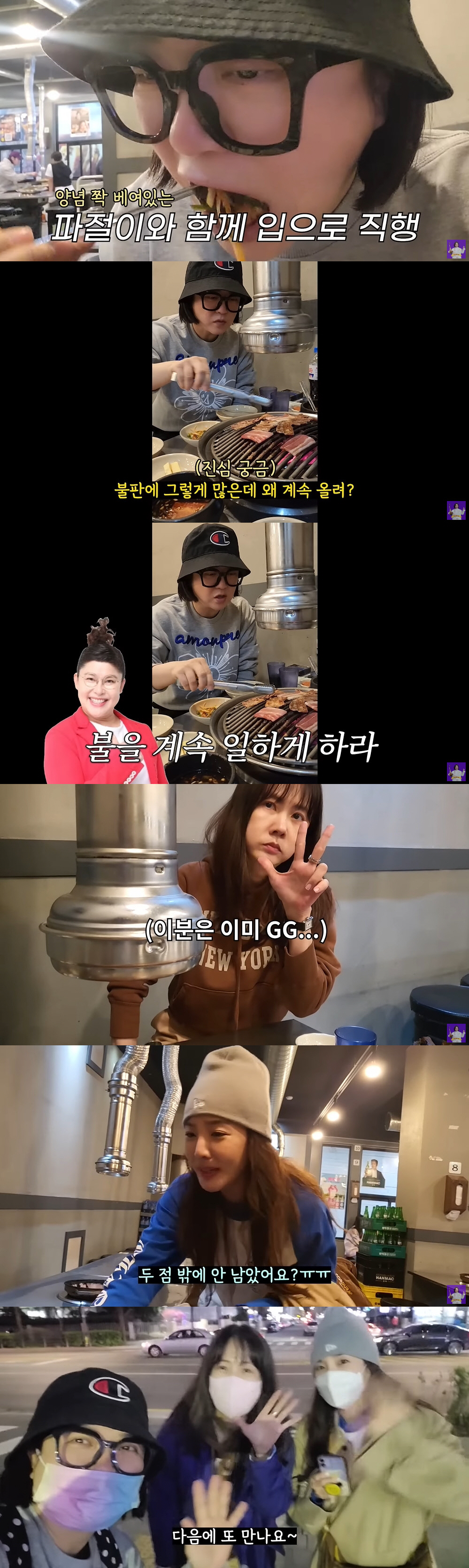 뒤늦게 합류한 산다라박은 "2점 밖에 안 남았다. 이걸로는 안된다"면서 불판 위에 있는 고기를 봤고, 김숙은 "다 내꺼다"고 해 웃음을 안겼다. 결국 산다라박을 위해 1인분을 추가, 김숙은 "최초로 1인분을 더 시켰다"고 했다. 이후 세 사람은 커피숍에서 웃고 떠들며 즐거운 시간을 마무리했다.