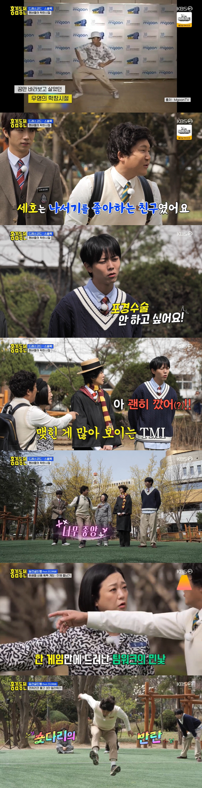 이후 본격 녹화를 진행, 이날 드레스 코드 '스쿨룩'에 맞춰 학창 시절로 되돌아간 멤버들은 학창 시절을 떠올렸다. 우영은 "중2 때부터 가수의 꿈을 갖고 있었기 때문에 누가 같이 놀자고 해도 '난 내 꿈이 있다'고 했다"고 떠올렸다. 조세호는 "세호는 나서기 좋아하는 친구였다. 항상 친구들에게 관심 받는 거 좋아했다"면서 "도경완 아나운서가 고등학교 친구다"고 했다. 이어 주우재는 '다시 돌아가고 싶은 학창시절'을 묻는 질문에 "초등학교로 돌아가서 포경수술 안 하고 싶다. 괜히 깠다"고 말해 폭소를 자아냈다. 이에 조세호는 "겨울에 엄마가 코끼리 돈가스 먹으러 가자고 해서 나갔다가 엉거주춤 돌아왔다"고 거들어 폭소를 자아냈다.