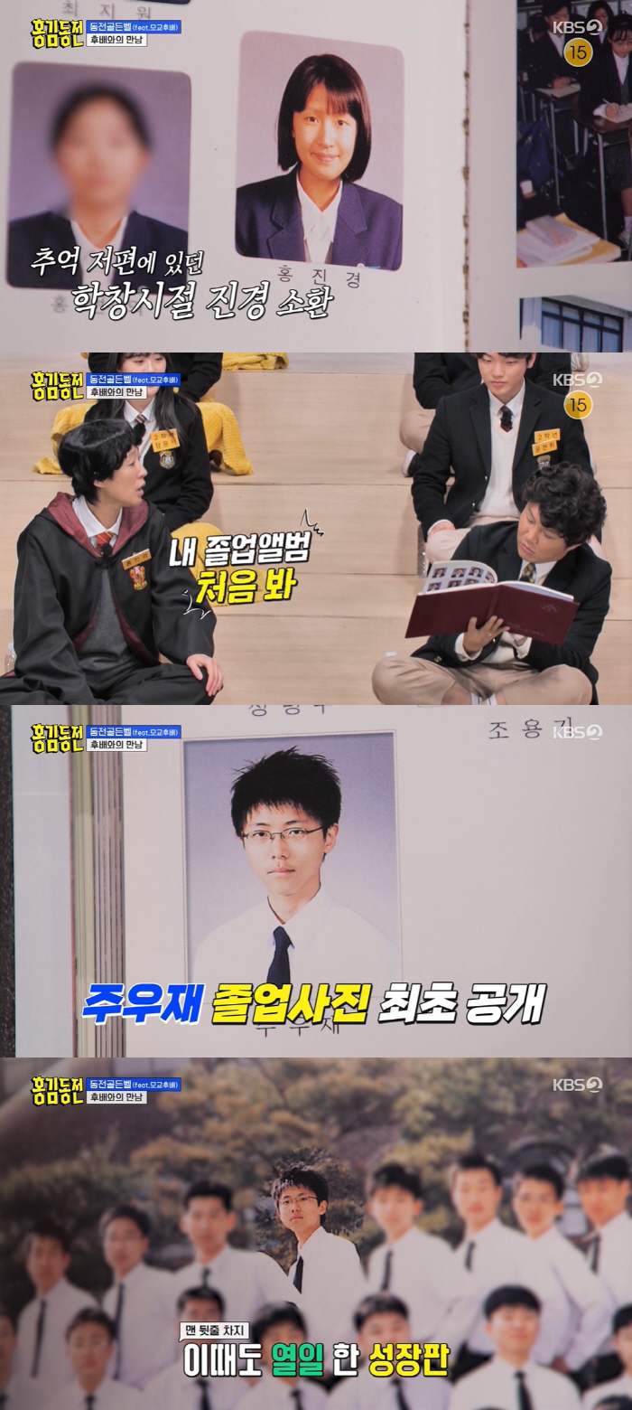 그때 홍진경과 주우재의 고등학교 졸업사진이 공개됐다. 홍진경의 졸업사진에 김숙은 "진경이 진짜 예쁘다"며 놀랐다. 앳된 얼굴과 단정한 단발머리의 고등학생 홍진경의 모습에 가장 놀란 사람은 홍진경 자신이었다. 그는 "내 졸업앨범을 진짜 처음 본다"라며 "나 졸업앨범이 없다. 이거 나 주면 안 되냐"라며 처음 보는 졸업앨범에 눈을 떼지 못했다.