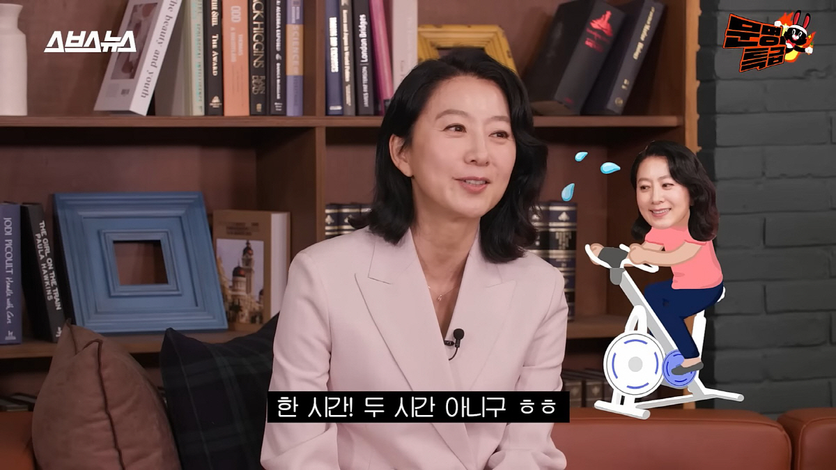 재재는 이날 "새벽 5시에 일어나서 두 시간 사이클링을 타신다고 들었다"고 묻자 김희애는 "너무 거창하다. 집에서 인도어 자전거를 타는 거다"라며 "두 시간은 아니고 한 시간을 탄다"고 말했다.