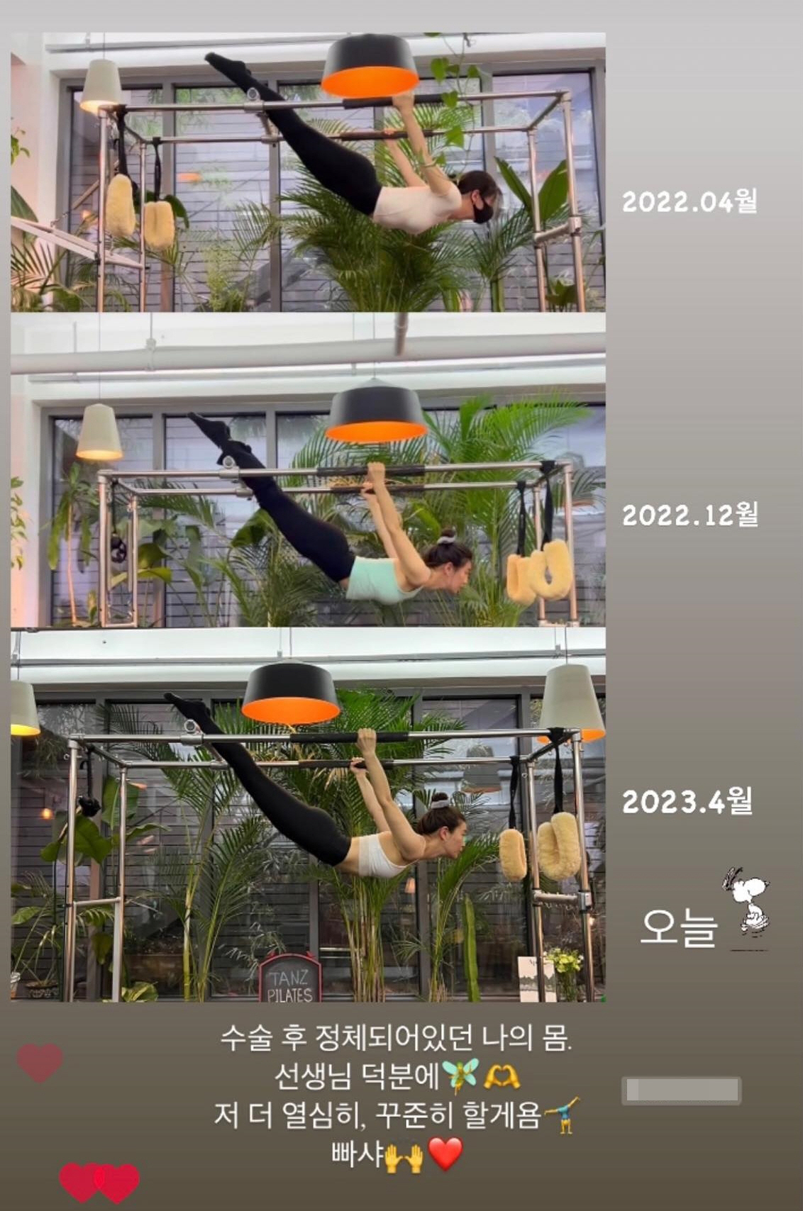 박소담은 6일 "수술 후 정체되어있던 나의 몸. 선생님 덕분에"라며 필라테스 강사에게 고마움을 드러냈다.