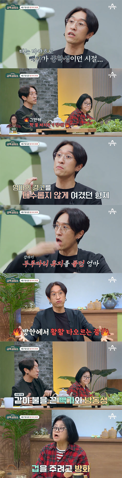 예고편에서 빽가는 "동생가 연년생이다. 사춘기가 오고나서 동생과 자주 싸웠다. 싸우고 있는데 엄마가 방에 들어오셔서 '너희 그만싸워'라고 말씀 하시고 나가셨다. 근데 '형 때문이다. 너 때문이다' 그러다가 또 싸웠다. 그때 엄마가 다시 들어오셔서 '그만해 확 불 싸지르기 전에'라고 하셨다. 근데 솔직히 어떻게 불을 지르겠냐라고 대수롭지 않게 여겼다. 그러고 나서 또 싸웠다. 그때 엄마가 방문을 확 열고 들어오시더니 두루마리 휴지를 막 푸시더니 거기에 라이터로 불을 확 지르셨다. 그리고 방에 던져버리고 방을 나가셨다. 근데 휴지에 불이 붙으니까 불이 확 나더라. 얼마나 무섭냐 막 울면서 '엄마 잘못했어'이러면서 불을 껐다. 그때 엄마한테 절대 이렇게 하면 안 되겠구나'라고 생각했다"라고 당시를 언급해 모두를 놀라게 만들었다.