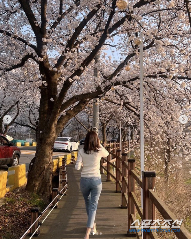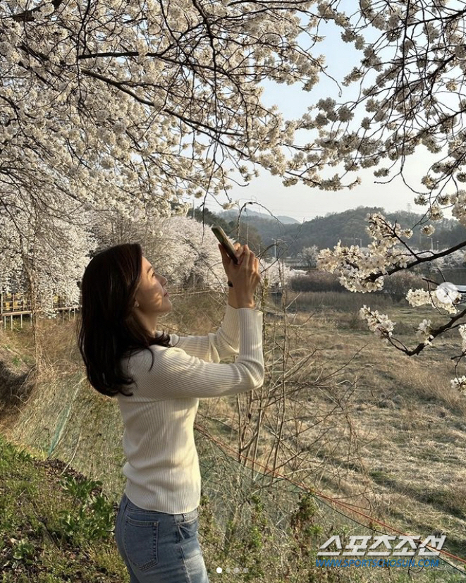 사진 속 김하늘은 청바지 차림의 캐주얼한 나들이 복장. 벚꽃을 구경하며 봄을 즐기는 모습이 더할나위 없이 사랑스럽다.