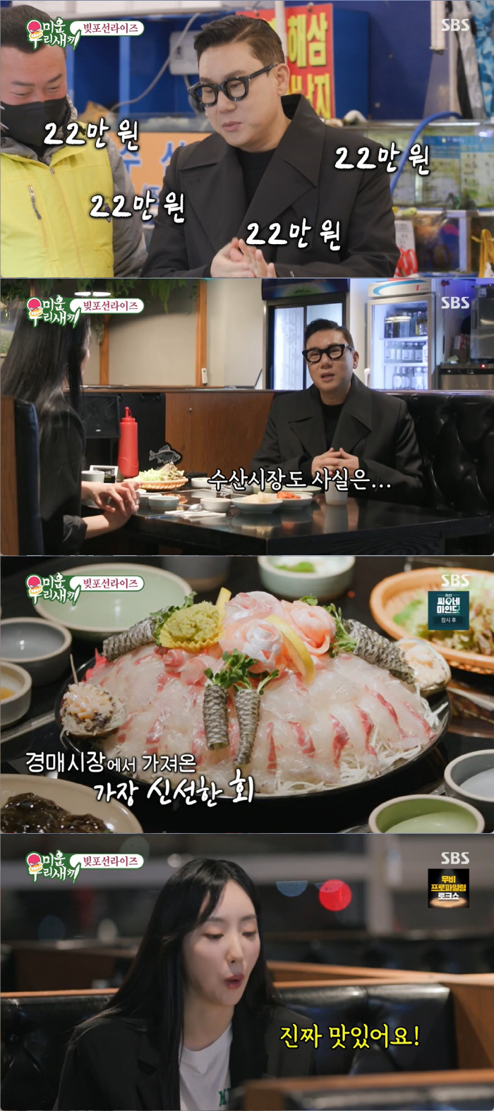새벽 4시라는 말에 모두가 입을 다물지 못했다. 이상민은 "회사 가장 맛있는 시간이다. 이시간에 경매를 한다. 그때 경매로 받은 고기로 회를 먹으면 맛있다. 해외를 가면 항상 새벽에 수산시장을 간다. 일본의 수산시장에 새벽 5시에 간다. 진짜 유명한 식당은 1시간이면 문을 닫는다. 유리씨 인생에서 가장 맛있는 회를 대접하려고 한다"며 허세를 부렸다. 이어 "여기 63빌딩에는 스테이크를 팔고 수산시장에는 회를 판다"라며 안내했다.