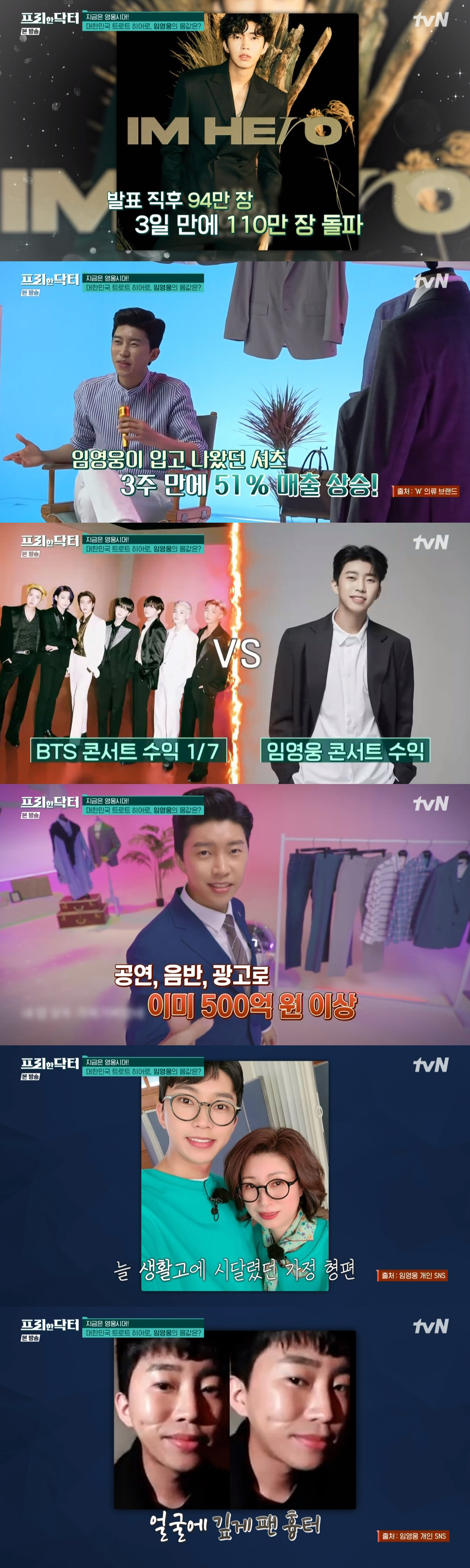 공연, 광고, 음반 수익만 500억 원 이상일 것으로 예상되는 가운데, 개인 채널과 음원 수익 또한 어마어마하다고. 임영웅의 개인 채널은 전체 조회수만 20억회를 넘겼고 1000만뷰 영상만 60여개 이상이다. 개인 채널 한달 수익만 10억 원 이상으로 추정되며 한달 음원 수익은 30억 원 이상이다.