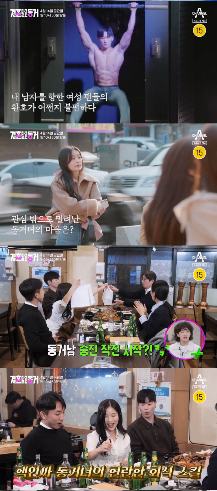 한편, 두 자매+언니의 남자친구가 함께하고 있는 '3인 동거남녀' 중 남자친구 김태훈의 회식자리에 '핵인싸' 여자친구 채상희가 함께했다. 채상희의 현란한 회식 스킬에 회식 분위기는 점점 달아올랐고, 아이키는 "태훈 씨 승진하시는 거 아니냐"라며 기대에 찼다.