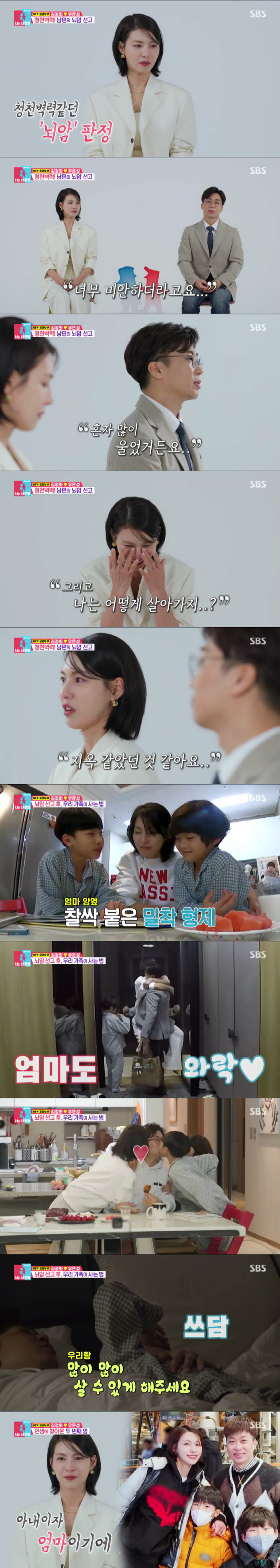 김정화는 남편에 대해 "자기 일에 열정적인 모습이 예뻐 보였다. 그게 제가 동경하는 모습이어서 더 매력적으로 느껴졌고, 결혼까지 하게 됐다"라며 남편의 매력을 자랑했다. 하지만 유은성은 뇌암 판정을 받아 충격을 줬다. 김정화는 "수술하면 90% 이상은 장애가 있을 수 있고, 50%는 사망할 수 있다고 하더라"라면서 첫 검진부터 수술 여부를 결정하기까지 걸린 3개월의 시간에 대해 "지옥 같았다"라며 눈물을 보였다. 김정화는 "종양이어도 좋으니 수술만 안 하게 해달라고 매일 기도했다"라며 당시의 아픈 기억을 떠올렸다. 이어 김정화는 진단 결과, 당장은 수술을 하지 않아도 된다는 소견을 받았다며 "너무 감사했다. '진짜 다행이다'란 생각만 들었다"라고 전했다. 유은성은 "수술을 아예 안 해도 된다는 아니지만 지금은 수술을 안 하게 된 것만으로도 감사하다"라며 덧붙였다.