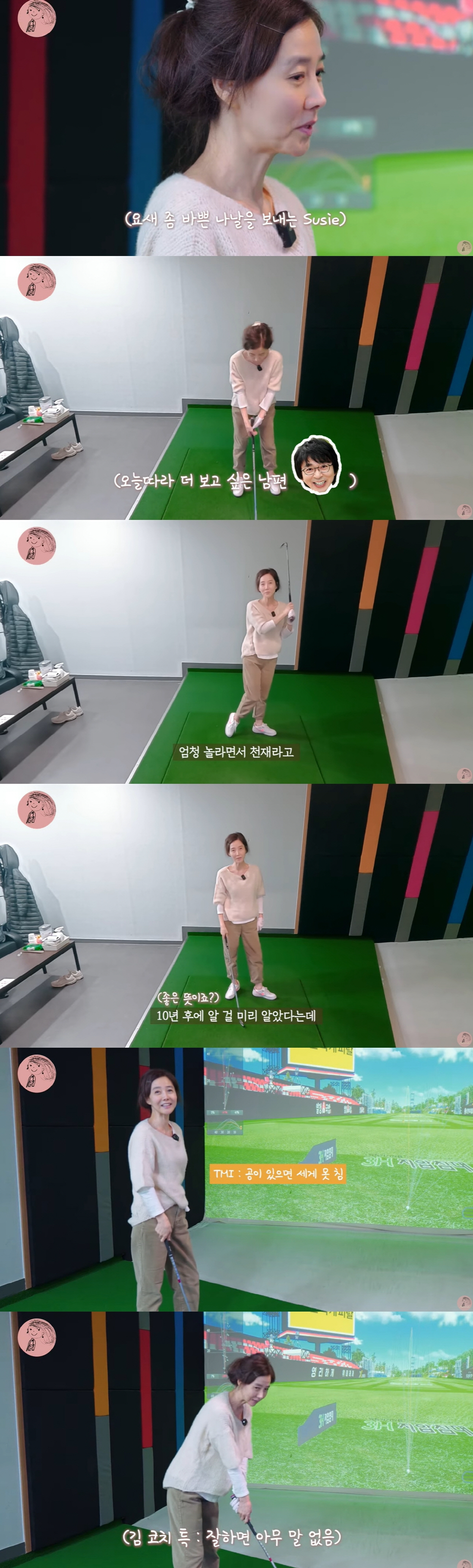 홀로 스크린 골프장을 찾은 강수지는 "오늘은 김국진 씨가 없다"며 "남편이 그냥 연습 많이 하라고 했다"고 말했다. 이어 "며칠 전에 집에서 스윙하는 걸 보여주면서 '이렇게 하는 게 맞죠?'라고 했더니 엄청 놀라면서 나한테 천재라고 했다. 그러면서 '10년 후에 알 걸 미리 알았다'고 하더라"며 무한 칭찬으로 자신감을 주는 '사랑꾼' 김국진을 깨알 자랑했다.