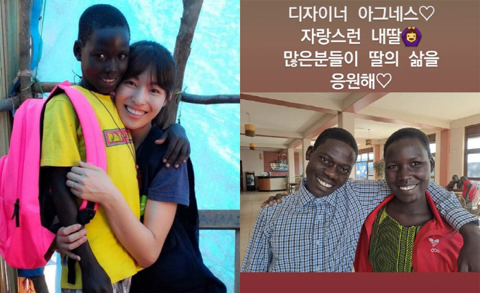 사진에는 남편과 어깨동무를하고 환하게 웃고 있는 아그네스의 모습이 담겨있다. 김정화와 아그네스의 인연은 지난 2009년부터 시작됐다. 김정화는 지난 10일 SBS '동상이몽'에서 "방송을 통해 아프리카를 처음에 갔다. 에이즈 걸린 아픈 고아가 된 아이의 엄마가 돼주는 프로젝트였다. 밥도 먹여주고 학교 가고 병원 데려가고 옷도 사주는 등 소소한 걸 해줬었다. 당시 27살이었고 결혼도 하지 않아 엄마 마음도 몰랐을 때인데 피붙이를 두고 가는 마음이 들었다. 이 아이가 건강하고 오래 살 수 있도록 좋은 엄마가 돼줘야겠다는 생각으로 인연을 이어가고 있다"라며 아그네스와 인연을 맺게 된 사연을 전했다.
