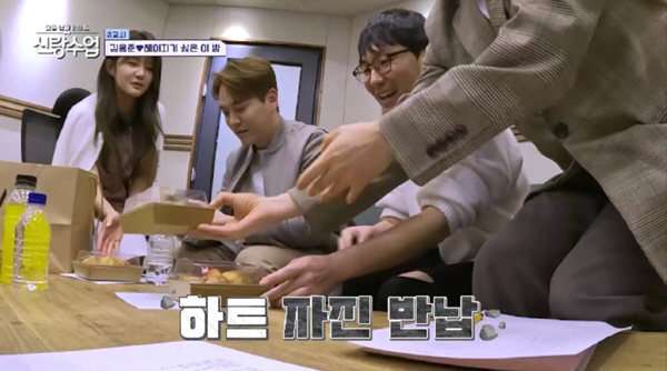 안근영은 직접 만든 샌드위치를 꺼내 스태프들에게 대접하는가 하면, "(딸기로 만든) 하트는 오빠 것~"이라고 달달한 멘트를 날렸다. 이후 두 사람은 노래로 호흡을 맞추며, 녹음실을 핑크빛으로 물들였다.
