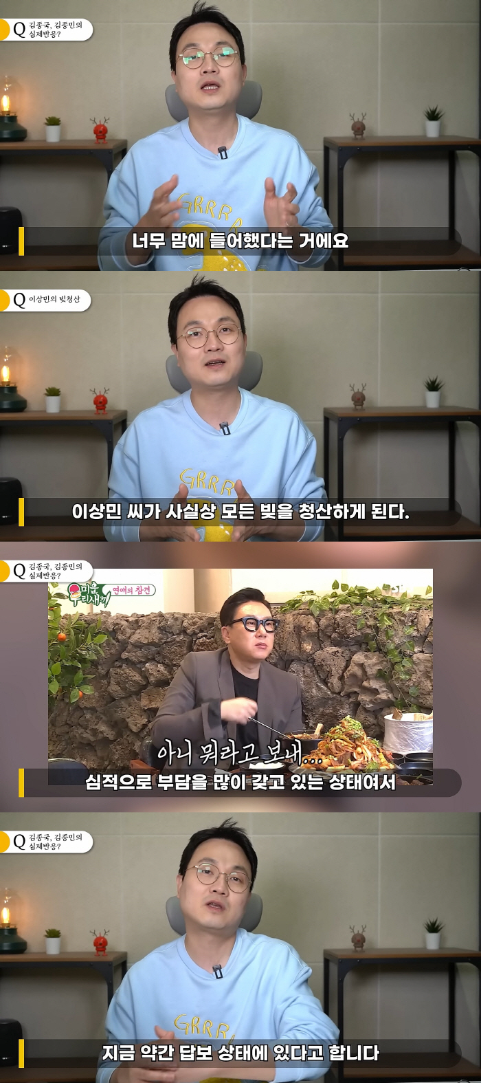 그는 이상민이 부담감을 갖는 이유에 대해 "이상민의 최측근들한테 물어보니까 이상민이 빚을 십 몇 년 동안 갚고 있기 때문에 집과 회사, 촬영만 반복하다 보니까 인간관계를 맺는 데 굉장히 큰 어려움을 겪고 있다고 한다"며 "김유리 씨에게 실제로 좋은 마음을 갖고 있지만, 마음을 터놓고 열기엔 힘든 상황이라 미안해하고 있다더라. 그도 어떻게든 더 해주고 싶은데 가까이 가도 되는지 고민하며 스스로 스트레스를 받다 보니까 주위에서도 안타까워한다"고 밝혔다.