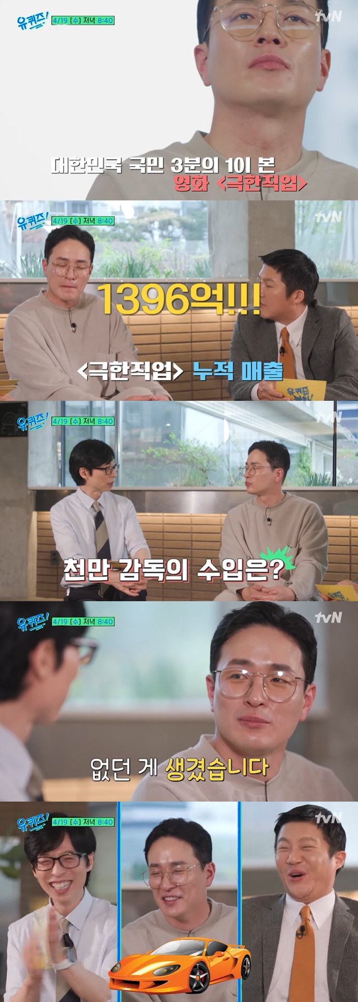 1626만 관객을 돌파한 영화 '극한직업'. 대한민국 국민 1/3이 본 이 영화의 누적 매출은 무려 1396억 원. 이병헌 감독은 "없던 게 생겼다"며 슈퍼카를 구매했음을 간접적으로 언급했다.