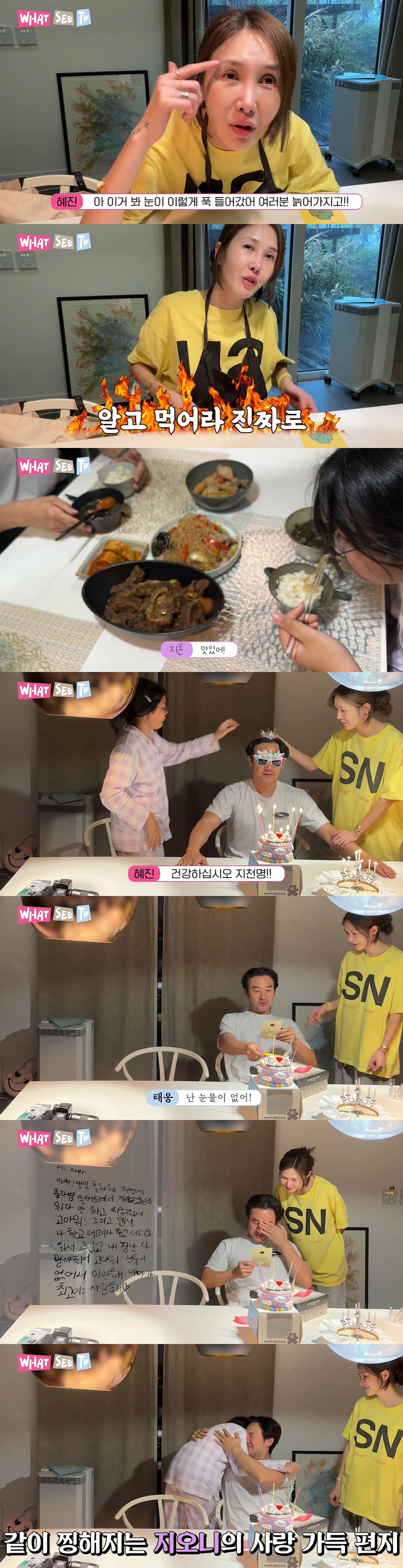 엄태웅의 생일 당일. 윤혜진은 갈비찜부터 미역국, 잡채, 닭볶음탕까지 열심히 요리를 준비했다. 윤혜진은 "눈이 푹 들어갔다. 늙어서 조금만 서 있어도 허리가 아프다. 이렇게 힘들지 않았는데 오늘 너무 힘들다. 알고 먹어라 진짜로"라고 했다.
