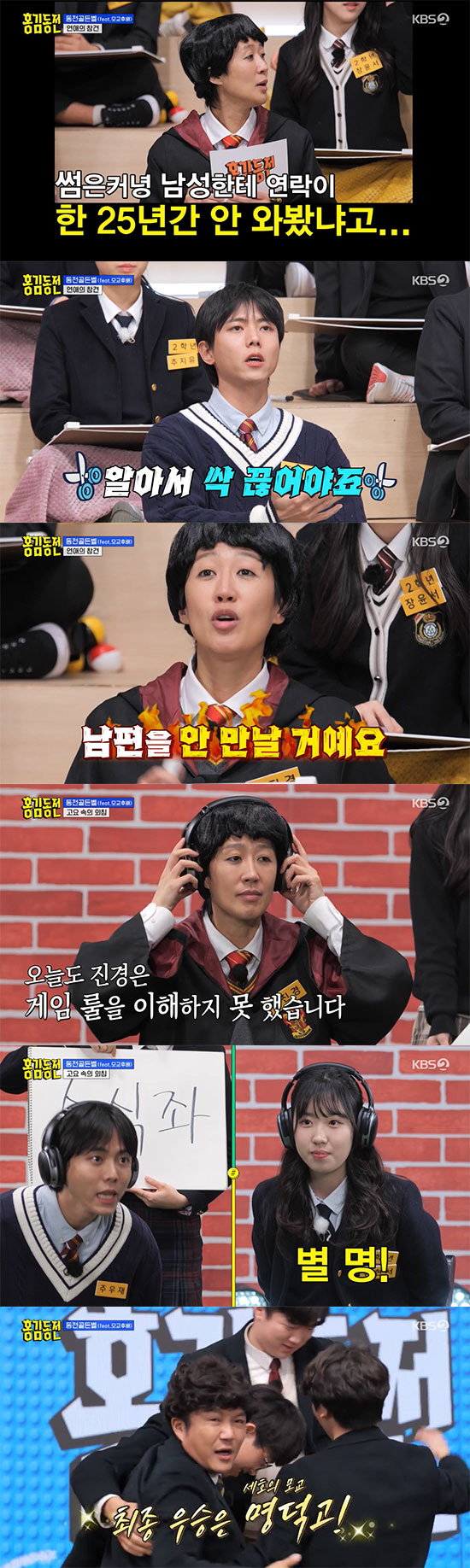 가장 많은 점수가 걸린 '고요 속의 외침'이 시작되자 김숙 라인, 조세호 라인, 주우재 라인, 우영 라인 등은 목이 터져라 소리를 지르며 필사적인 점수 내기에 돌입했다. 헤드셋을 낀 채 문제를 맞히기 시작한 홍진경은 후배가 내는 문제를 들으며 두 눈을 동그랗게 뜬 채 점점 알 수 없는 표정을 짓더니 다급하게 "타임!"을 외쳤다. 그러면서 진지한 표정으로 "진짜 너무 안 들려"라고 말해 모두를 놀라게 했다. 김숙은 "아예 안 들려"라며 황당해 했고, 주우재는 "그게 게임이에요"라고 설명했다. 의아한 표정을 짓던 홍진경은 "뭐?"라고 되물은 후 "아니 심하게 안 들린다고"라고 외쳐 모두를 빵 터지게 만들었다. 결국 한 문제도 맞추지 못했다.