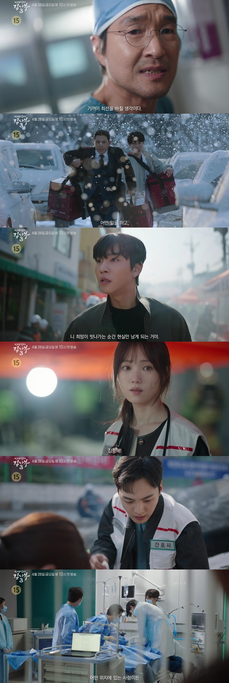 김사부가 외상센터를 설립하고 싶었던 이유는 오직 하나 평등한 생명을 살리기 위해서다. 이어 아비규환의 재난 현장 속 사람들을 살리기 위해 애쓰는 의료진들의 고군분투가 펼쳐졌다. 혼란에 빠진 서우진(안효섭)과 의지를 다지는 차은재(이성경), 다급하게 달리는 박은탁(김민재)과 박민국(김주헌)의 모습이 이어지고, '우리는 모든 것을 걸었다'라는 문구가 돌담져스의 필사의 활약을 예고했다.