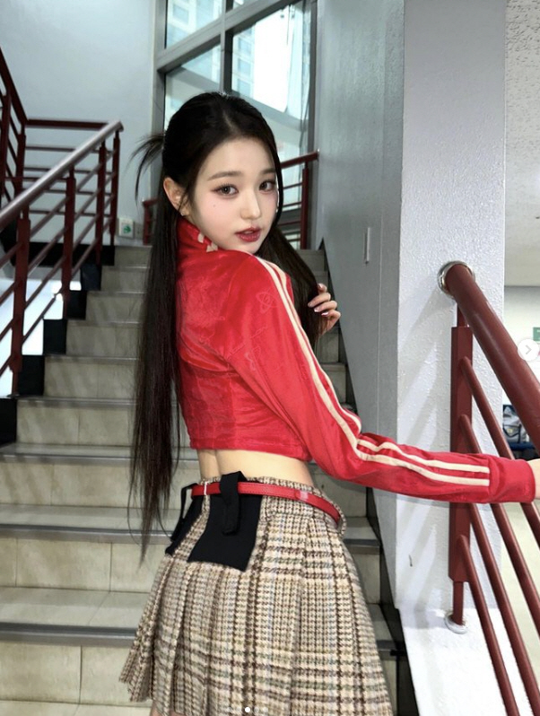 장원영은 크롭 츄리닝에 교복 치마를 입고 반스타킹과 운동화로 포인트를 줬다. 평범한 계단에서 찍은 사진인데 패션쇼 런웨이를 연상시키는 분위기로 만들어 눈길을 끌었다.