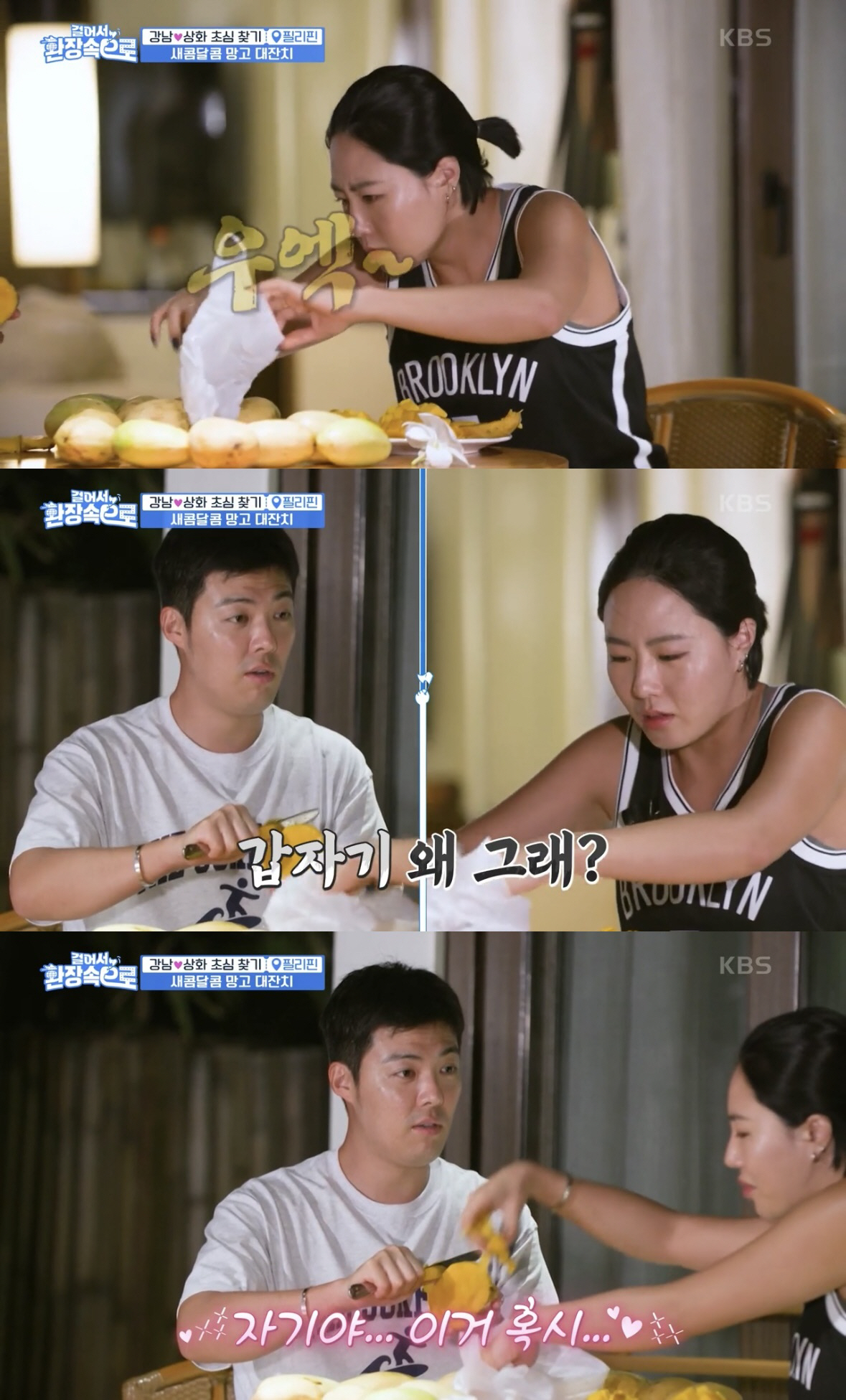 이날 첫날 일정을 마친 두 사람은 숙소에 돌아와 망고 먹방을 펼쳤다. 이 때 망고를 먹던 이상화가 헛구역질을 하자, 강남은 이상화에 "자기야, 설마"라고 말했다. 강남의 반응을 본 스튜디오 MC들은 혹시 강남과 이상화 부부에 2세 소식이 있는 건 아닌가 싶어 기대감을 드러냈다.