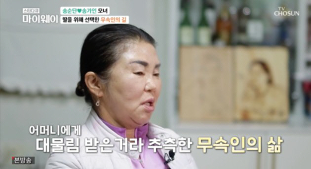 특히 송가인은 어머니 송순단 씨는 무속인의 길을 걷게 된 이유에 대해 "딸을 낳고 돌지나서부터 아프기 시작했는데, 너무 아팠다. 아파서 밥도 못할 정도고 일어나서 물도 못 먹을 정도로 아팠다. 사람들이 이상하다고 점을 해보라고 했다"라며 당시를 회상했다.