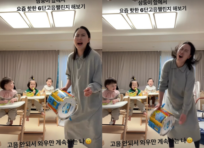 [스포츠조선닷컴 김수현기자] 코미디언 황신영이 삼둥이 앞에서 열창으로 웃음을 자아냈다.