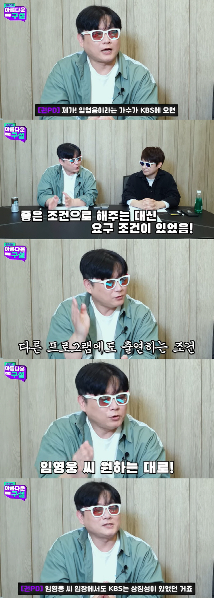 이세준은 "KBS에서는 왜 임영웅이어야 했나. 그건 솔직히 수긍이 된다. 근데 임영웅 씨 입장에서는 왜 KBS였냐"고 궁금해했다. 권PD는 "KBS는 이미 나훈아, 심수봉 단독쇼를 했다. 다음 대기획이 필요했다. 임영웅 씨가 TV조선 계약이 끝난 후 KBS에서 우리가 잡자 했다. 그때 국장님과 CP들이 모여 여러 논의가 나왔다"며 "제가 임영웅이라는 가수가 KBS에 오면 어떤 이점이 있는지 강하게 이야기했다. 시청자들이 원하고 그 시대의 슈퍼스타가 자유롭게 활동하면서 KBS와 안 하게 되면 우리는 뺏기는 거라 했다. 임영웅이 돋보이는 큰 프로그램을 만들어야 한다고 했다. 나훈아, 심수봉의 연장선으로 쇼를 제작해야 한다고 했다"고 밝혔다.