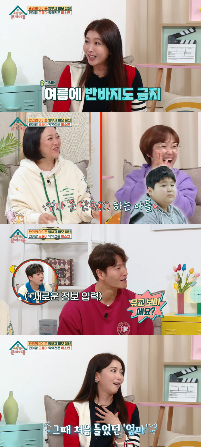 그런가 하면 민이의 귀여운 매력도 공개해 스튜디오에 웃음을 안겼다. 오윤아는 민이가 유교 보이라면서 "제가 민소매를 입고 있으면 꼭 옷을 입으라고 갖다 준다. 여름에 더워죽겠는데 반바지도 못 입는다. 자꾸 긴 바지를 입으라고 한다"라고 전했다. 또 "자기는 다 벗고 다니면서 나한테는 옷을 입으라고 한다"고 덧붙여 폭소를 자아냈다.