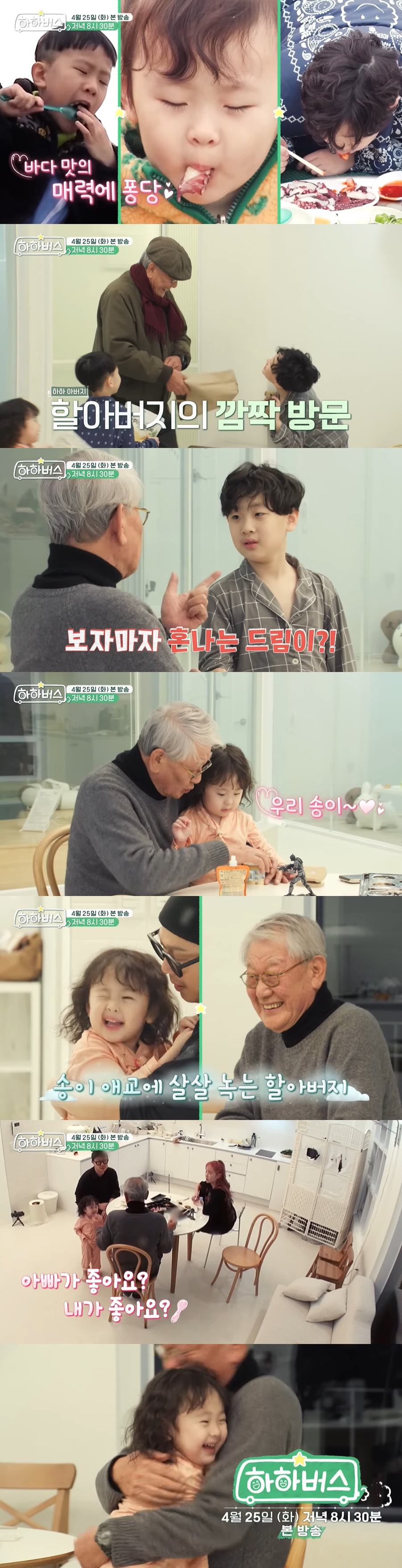 그때 "할아버지 왔다"면서 하하의 아버지 할아버지가 깜짝 방문, 드소송의 얼굴에는 웃음꽃이 피었다. 할아버지는 드림이를 향해 "너 왜 전화 안 받냐"고 했다. 그러면서 송이를 향해서는 "우리 송이"라면서 꼭 안은 채 행복한 미소를 지어보였다. 이어 송이의 윙크 애교에 살살 녹는 할아버지였다. 그때 송이는 "아빠가 좋냐, 내가 좋냐"고 물었고, 할아버지는 "물론 송이가 예쁘다"면서 손녀를 꼭 안아줬다. 할아버지의 대답에 환한 미소를 짓는 송이의 모습은 러블리 가득했다.