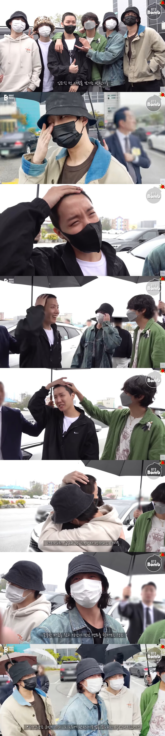 멤버들은 "다음 입대는 누구냐" "머리가 잘 어울린다"며 장난을 치면서도 아쉬운 마음을 드러냈다. 정국은 "진 형 군대갈 땐 좀 그랬는데 홉이 형 갈 땐 좀 뭉클하다"고, RM은 "제이홉 가니까 너무 슬퍼서 술을 마셨다. 기분이 이상하다"며 눈물을 보였다. 제이홉의 입대 현장에는 휴가를 나온 진도 함께 했다. 비록 현역 군인 신분인 관계로 직접 영상에 모습을 드러내진 않았지만 멤버들이 "왜 이렇게 멋있어졌냐"는 말로 반가움을 대신했다.