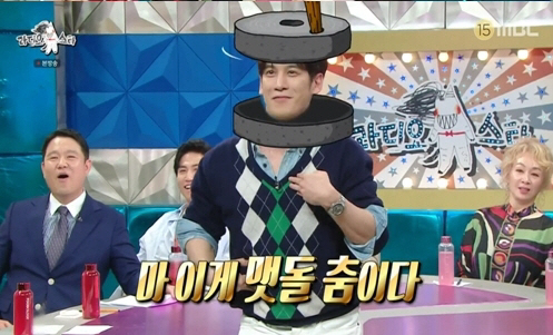 이날 박기웅은 자신을 스타로 만들어준 '맷돌 춤 CF' 비하인드를 대방출했다. 그는 배우 김동욱과 휴대폰 광고 모델 자리를 놓고 같이 CF 촬영을 진행했다고 밝히면서 "맷돌 춤이 매우 슬픈 춤이다. 3박 4일 촬영을 마치고 발가락 피부가 다 벗겨졌다"라고 후일담을 전했다. 이와 함께 박기웅은 '라스'에서 다시 한번 맷돌 춤을 선보이자 MC들은 "다시 보니 매우 슬픈 춤이다"라고 반응해 폭소케 했다.