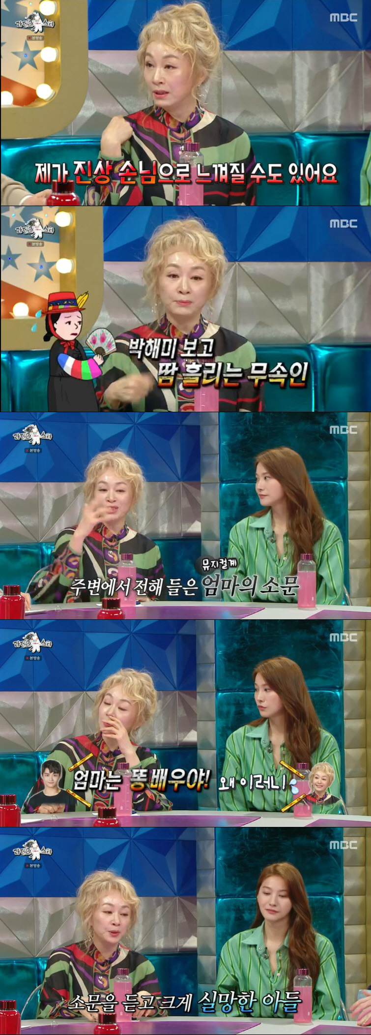 하지만 원조 센 언니 박해미가 유일하게 약해지는 사람이 있었다. 바로 뮤지컬 배우인 아들 황성재. 박해미는 "이 친구도 뮤지컬을 하다 보니까 엄마에 대한 소문을 듣나 보더라. 어느날 갑자기 엄마는 '똥배우'라더라. '항상 늦는다며?' 하는데 할 말이 없더라. 아들 입장에서는 창피한 거 같더라"라고 밝혔다.