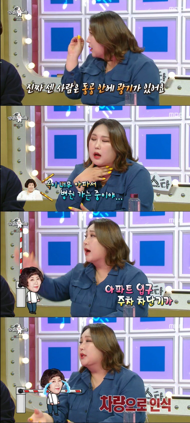 그러면서 풍자는 "지금 기루 언니가 아프다. 저한테 연락이 와서 목이 너무 아파서 병원에 간다더라. 쇠몽둥이로 목을 맞았다더라. 나쁜 사람한테 당했나 걱정했는데 알고 보니까 단지 입구 들어가는데 주차 차단기가 차량으로 인식해 목을 맞았다더라. 미니SUV로 착오가 돼서 목이 많이 아픈 상황"이라 폭로했다.