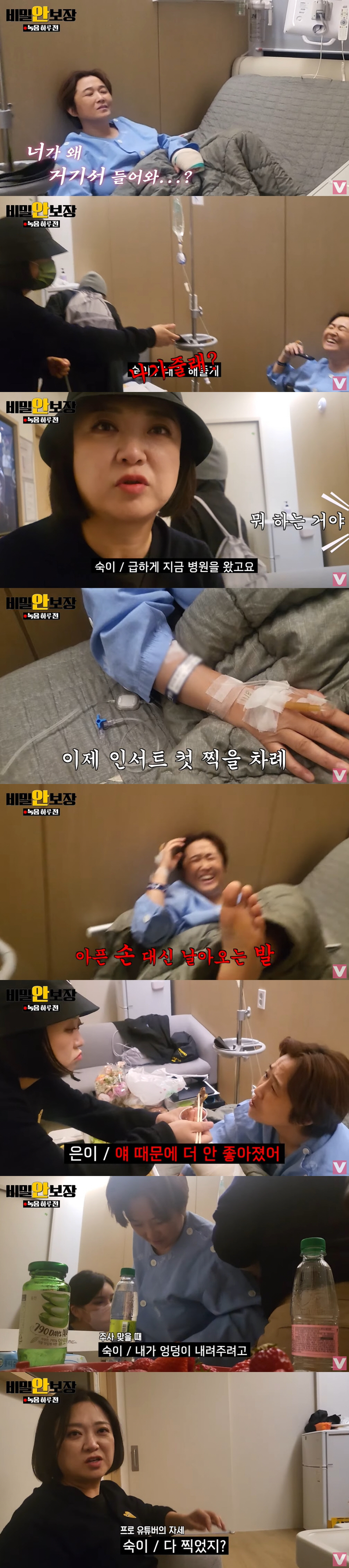 이어 송은이가 "손이 욱신욱신하고 후끈후끈하다"고 하자, 함께 병문안을 온 최강희는 "기분 너무 안 좋겠다"고 했다. 그러자 송은이는 "너무 안 좋은데 얘(김숙) 때문에 더 안 좋아졌다"고 해 폭소를 안겼다. 또한 김숙은 송은이가 주사 맞을 때 바지를 내려주는 등 계속해서 유튜브 영상을 뽑아냈다. 이에 송은이는 "자꾸 자기 미담 찍으려고"라고 하자, 김숙은 "잘 찍고 있냐"면서 꿋꿋이 간호 코스프레를 이어가 웃음을 자아냈다.